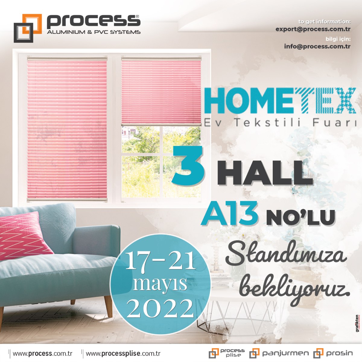 Process Plise - HOMETEX 2022 EV TEKSTİLİ FUARI17-21 Mayıs 2022 tarihleri arasında İstanbul Fuar Merkezinde HOMETEX 2022 EV TEKSTİLİ FUARI'nda 3 Hall A13 No'lu standımızda siz değerli misafirlerimizi aramızda görmekten mutluluk duyarız. ...DEVAMINI OKU